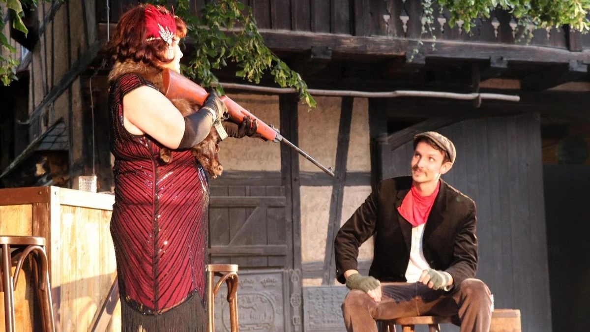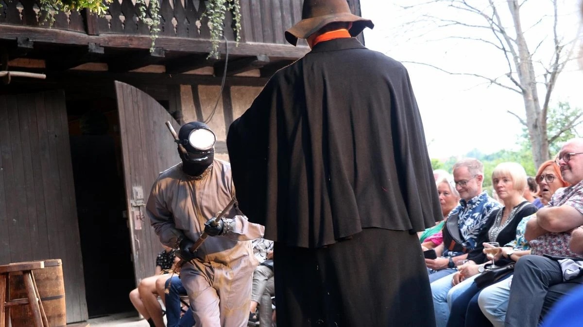 Aber glücklicherweise verrät es am Premierenabend keiner. Stattdessen wird jede Szene mit Applaus bedacht. Der Straßenfeger der frühen 1960er Jahre wieder live und blutig an den Bauernhäusern. Was also einst Joachim Fuchsberger, Elisabeth Flickenschildt, Eddi Arendt, Brigitte Grothum, Siegfried Schürenberg und Klaus Kinski im Film waren, das sind nun – neben Frank Grünert und Chris Henkel – Lukas Hercher, Ursula Jahn, Dominique Lattich, Luca Nauschütz, Kassandra von den Steinen und Conrad Voigt vom Ensemble des theater-spiel-ladens Rudolstadt. Vor vierzehn Jahren entwickelte man hier die Idee, das Gelände der Thüringer Bauernhäuser zu nutzen, um im dortigen Hof Sommertheater anzubieten.