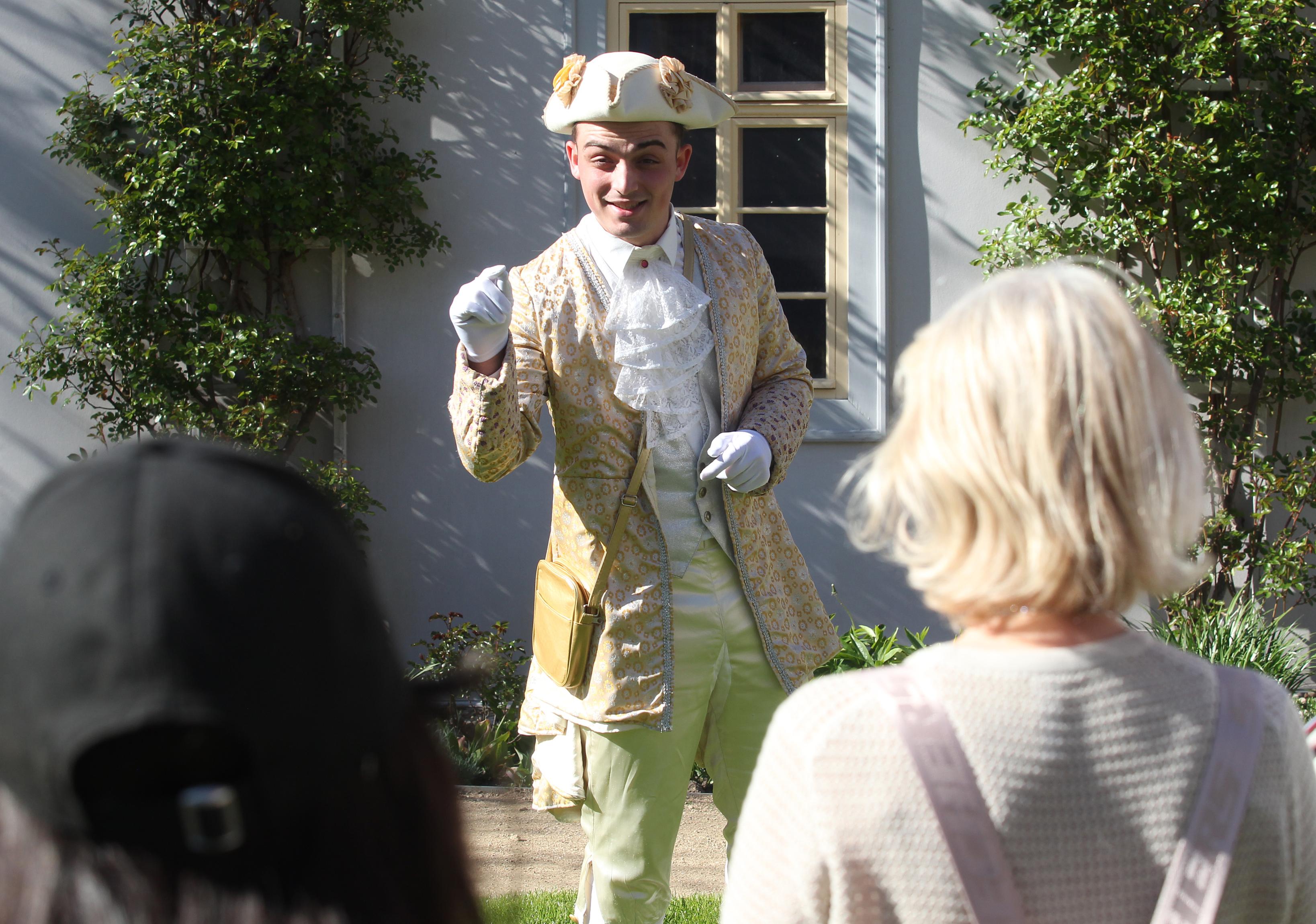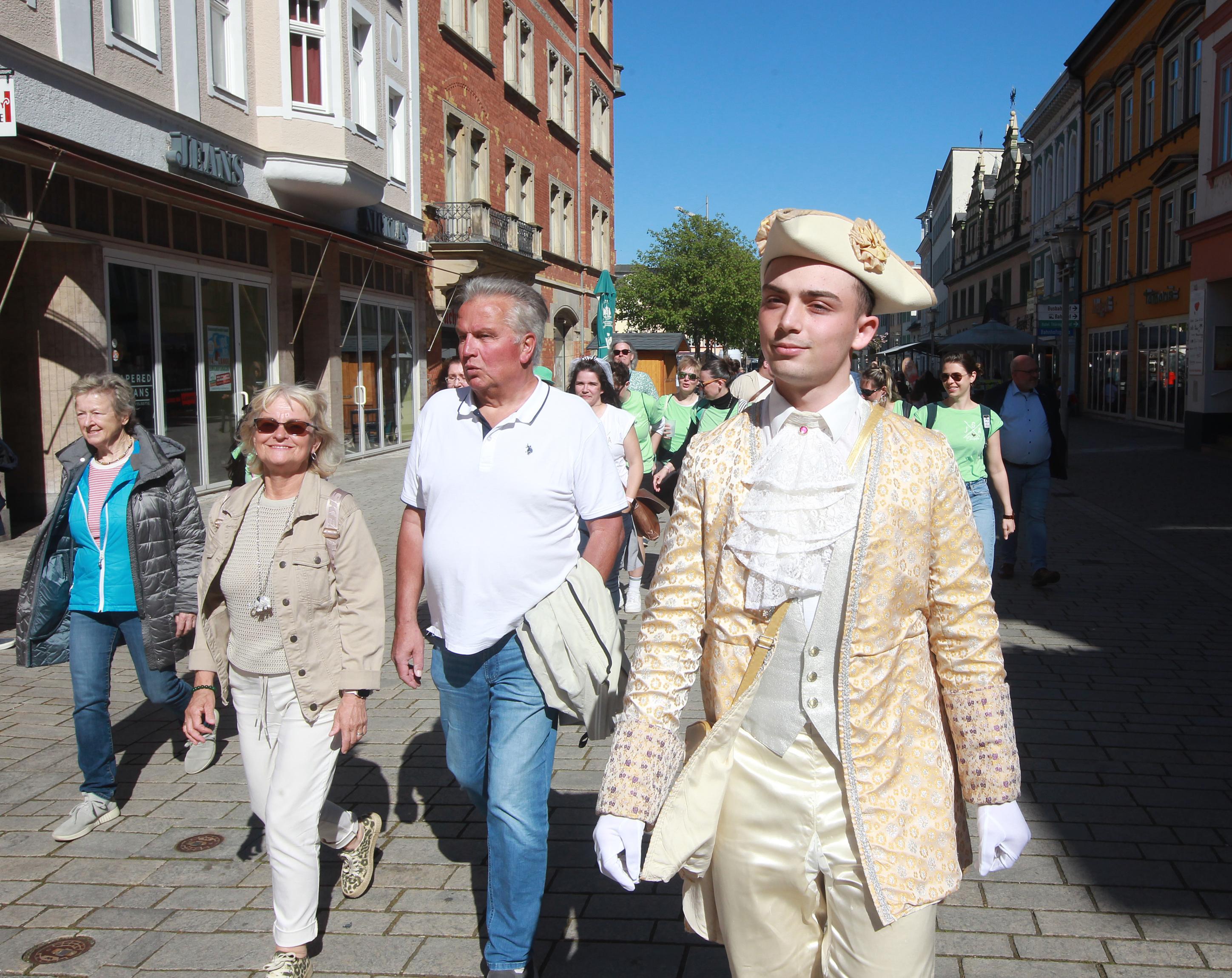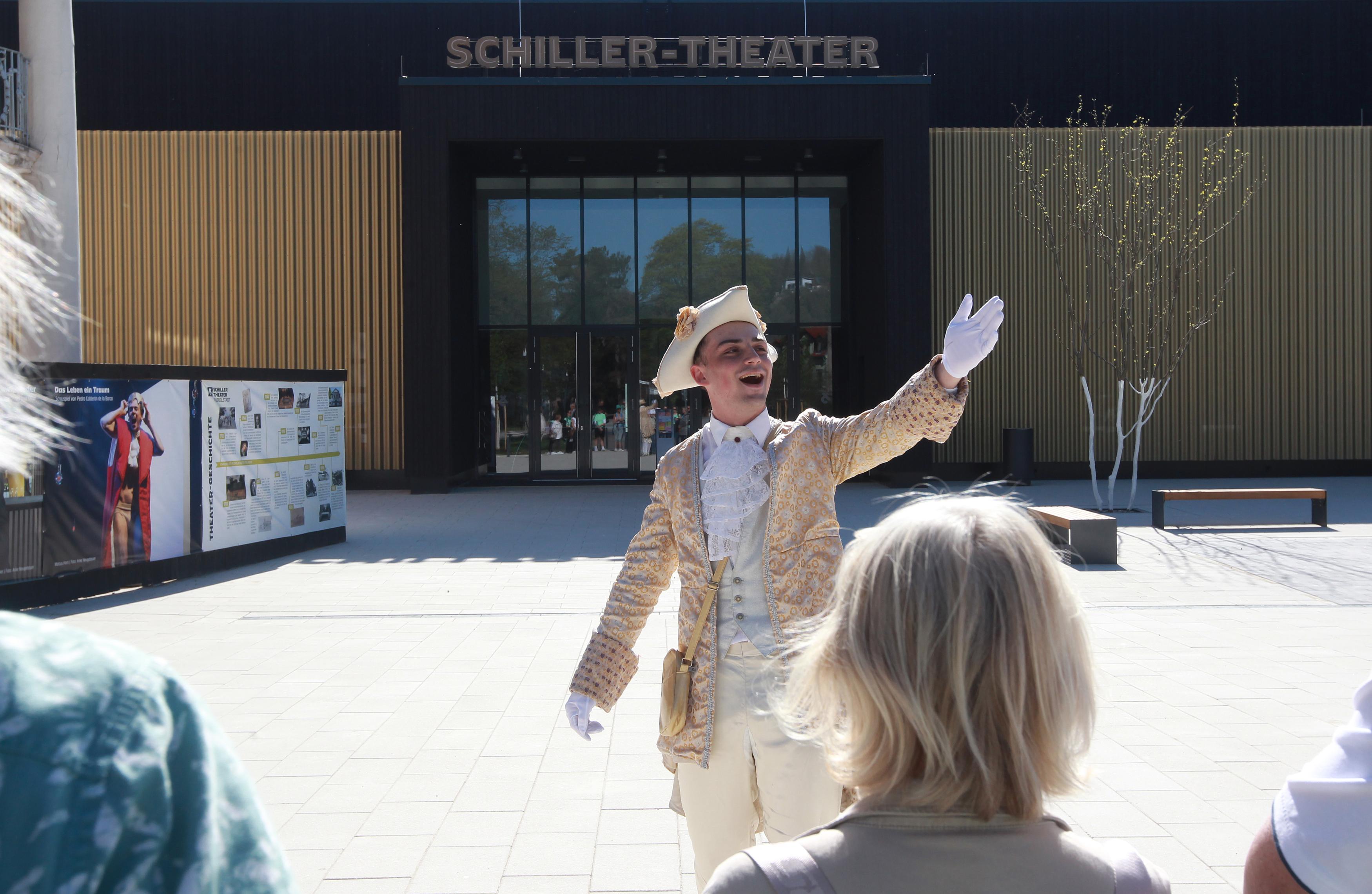 In der Residenzstadt ist ein junger Mann unterwegs, der es mit dem Briefgeheimnis nicht allzu genau nimmt. Zum Glück. Denn der Liebesbriefbote, charmant und überzeugend gespielt von Denis Dafin Peter, führte am 25. April erstmals durch die historische Innenstadt und ihre Vergangenheit. „Schillernde Geheimnisse“ heißt der Spaziergang auf Schillers Spuren. Nach einem Text des 2021 verstorbenen Schriftstellers und Publizisten Matthias Biskupek hat der theater-spiel-laden diese Zeitreise aus Anlass des 1250. Stadtjubiläums in Szene gesetzt.